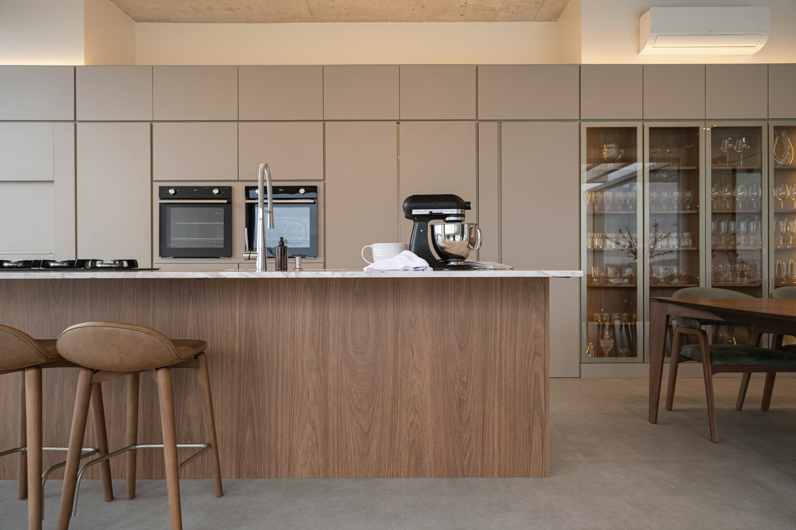 Centred around a freestanding island that adds extra preparation space, storage, and a social hub for family or guests.